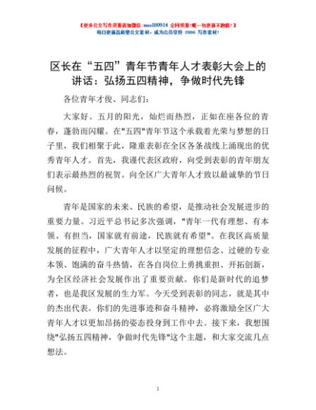 / 区长在“五四”青年节青年人才表彰大会上的讲话:弘扬五四精神,争做时代先锋
