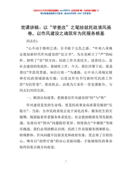 / 党课讲稿:以“学查改”之笔绘就民政清风画卷,以作风建设之魂筑牢为民服务根基