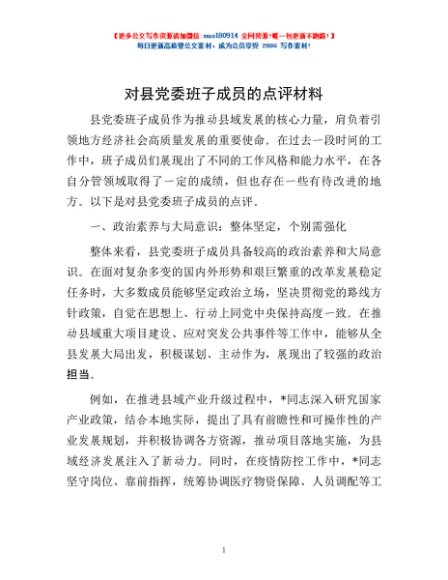 / 对县党委班子成员的点评材料