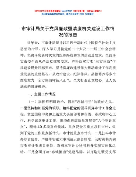 / 市审计局关于党风廉政暨清廉机关建设工作情况的报告