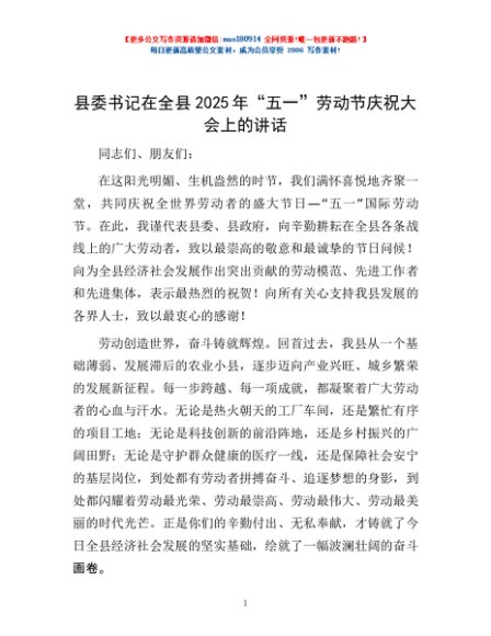 / 县委书记在全县2025年“五一”劳动节庆祝大会上的讲话