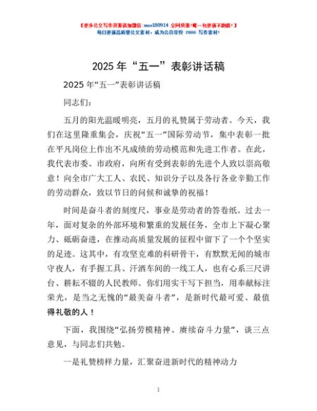 / 2025年“五一”表彰讲话稿