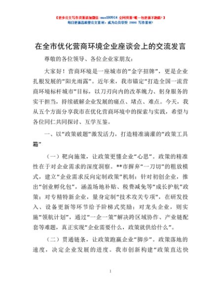 / 在全市优化营商环境企业座谈会上的交流发言