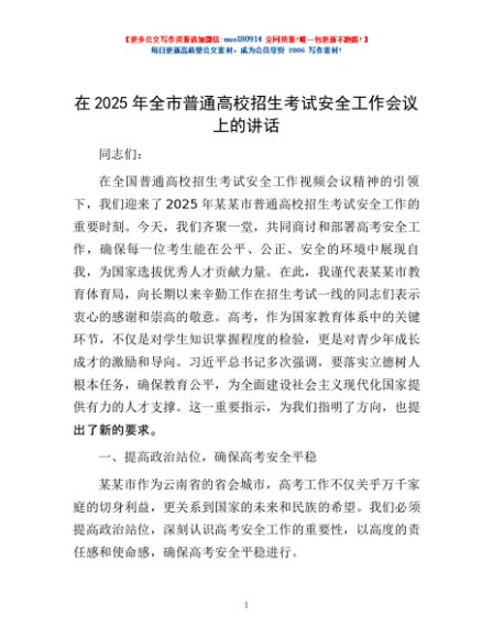 / 在2025年全市普通高校招生考试安全工作会议上的讲话