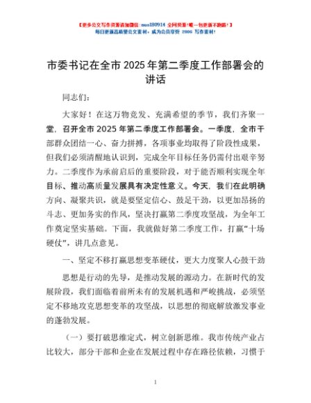 / 市委书记在全市2025年第二季度工作部署会的讲话
