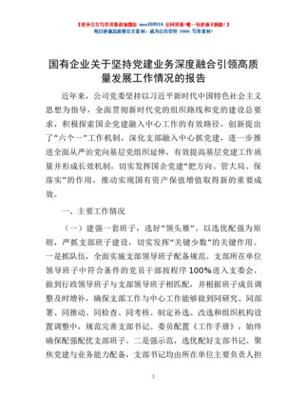 / 国有企业关于坚持党建业务深度融合引领高质量发展工作情况的报告