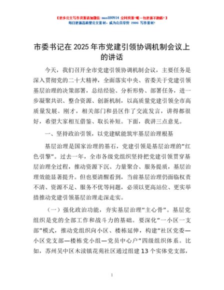 / 市委书记在2025年市党建引领协调机制会议上的讲话