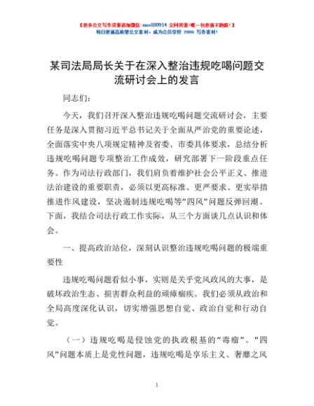 / 某司法局局长关于在深入整治违规吃喝问题交流研讨会上的发言