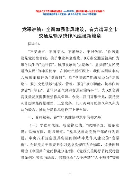 / 党课讲稿:全面加强作风建设,奋力谱写全市交通运输系统作风建设新篇章