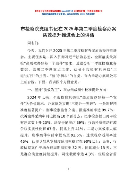 / 市检察院党组书记在2025年第二季度检察办案质效提升推进会上的讲话
