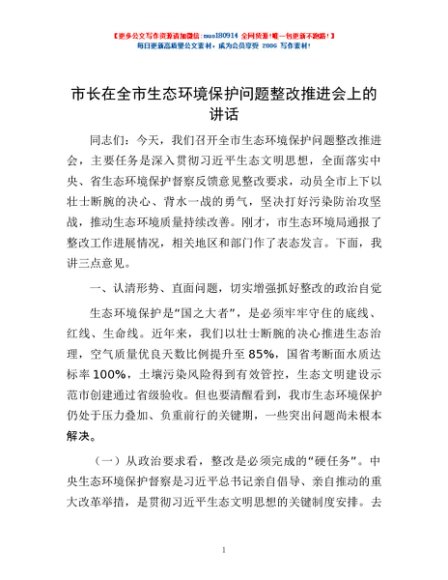 / 市长在全市生态环境保护问题整改推进会上的讲话