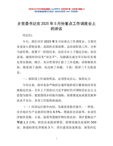 / 乡党委书记在2025年5月份重点工作调度会上的讲话