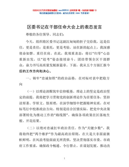 / 区委书记在干部任命大会上的表态发言