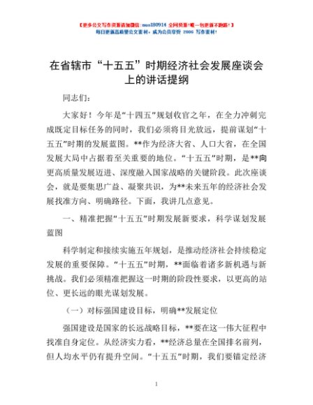 / 在省辖市“十五五”时期经济社会发展座谈会上的讲话提纲