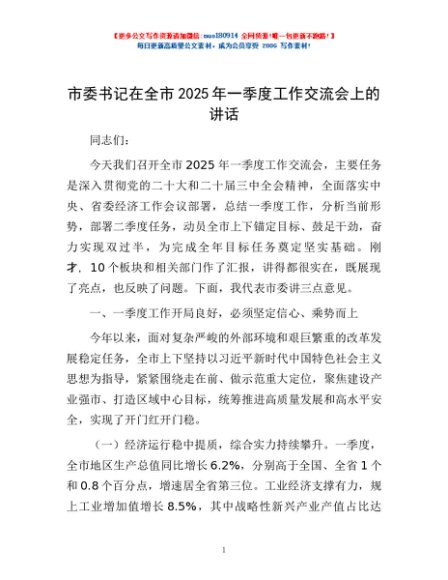 / 市委书记在全市2025年一季度工作交流会上的讲话