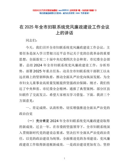 / 在2025年全市妇联系统党风廉政建设工作会议上的讲话