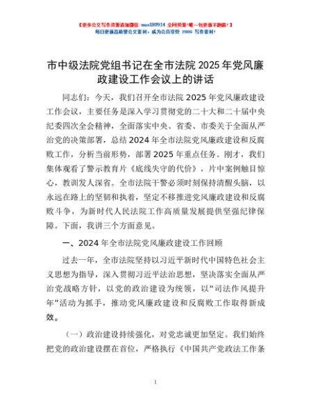 / 市中级法院党组书记在全市法院2025年党风廉政建设工作会议上的讲话
