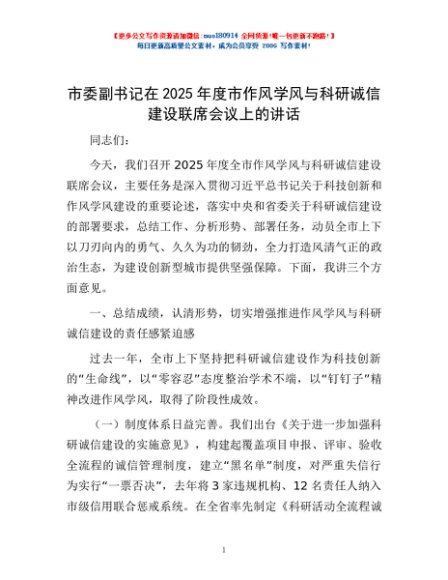 / 市委副书记在2025年度市作风学风与科研诚信建设联席会议上的讲话