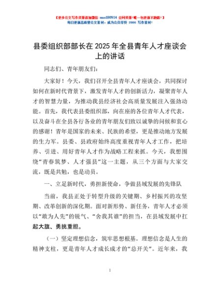 / 县委组织部部长在2025年全县青年人才座谈会上的讲话