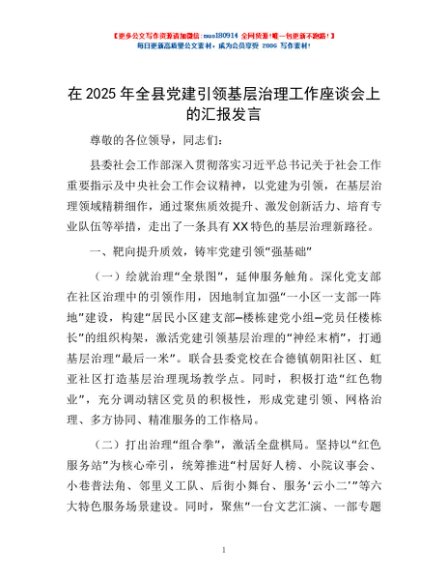 / 在2025年全县党建引领基层治理工作座谈会上的汇报发言