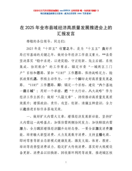 / 在2025年全市县域经济高质量发展推进会上的汇报发言