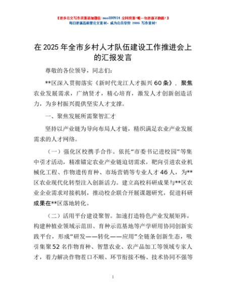/ 在2025年全市乡村人才队伍建设工作推进会上的汇报发言