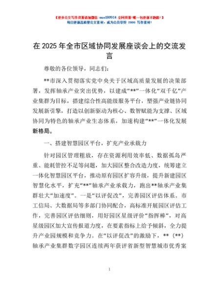/ 在2025年全市区域协同发展座谈会上的交流发言