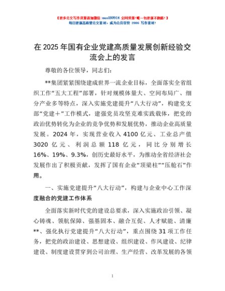/ 在2025年国有企业党建高质量发展创新经验交流会上的发言