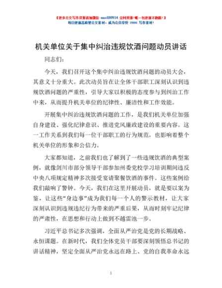 / 机关单位关于集中纠治违规饮酒问题动员讲话