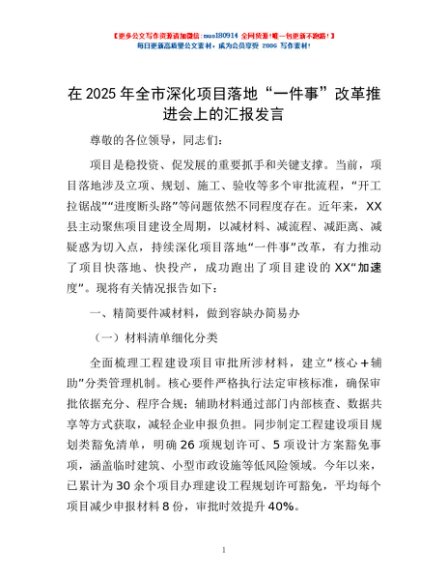 / 在2025年全市深化项目落地“一件事”改革推进会上的汇报发言
