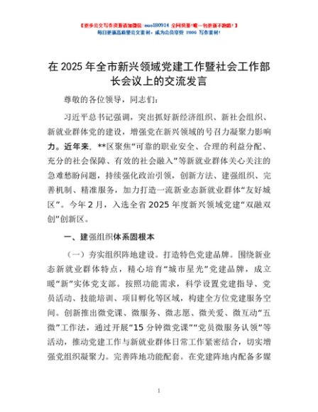 / 在2025年全市新兴领域党建工作暨社会工作部长会议上的交流发言
