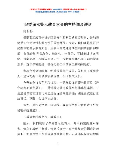 / 纪委保密警示教育大会的主持词及讲话