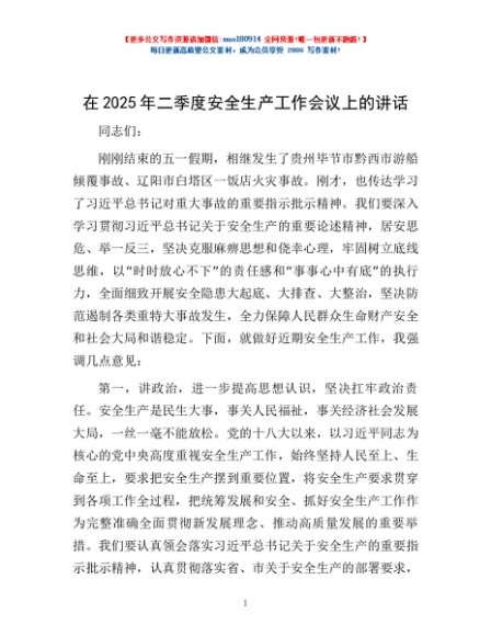 / 在2025年二季度安全生产工作会议上的讲话