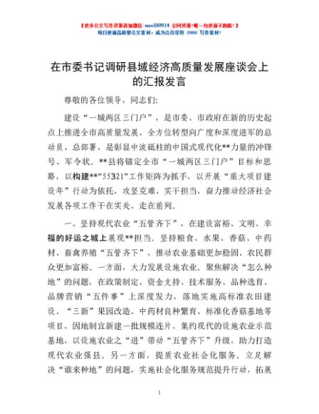 / 在市委书记调研县域经济高质量发展座谈会上的汇报发言