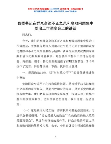 / 县委书记在群众身边不正之风和腐败问题集中整治工作调度会上的讲话