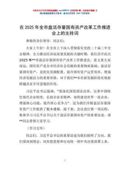/ 在2025年全市盘活存量国有资产改革工作推进会上的主持词