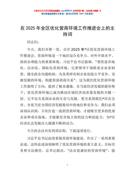 / 在2025年全区优化营商环境工作推进会上的主持词