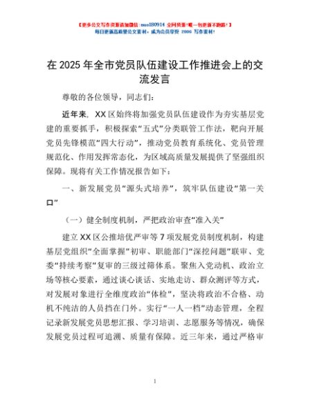 / 在2025年全市党员队伍建设工作推进会上的交流发言