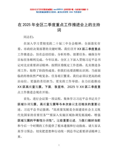 / 在2025年全区二季度重点工作推进会上的主持词