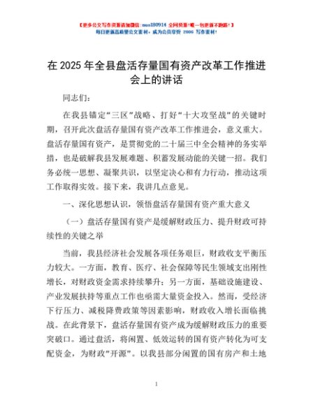 / 在2025年全县盘活存量国有资产改革工作推进会上的讲话