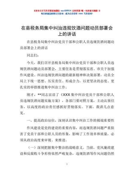 / 在县税务局集中纠治违规饮酒问题动员部署会上的讲话