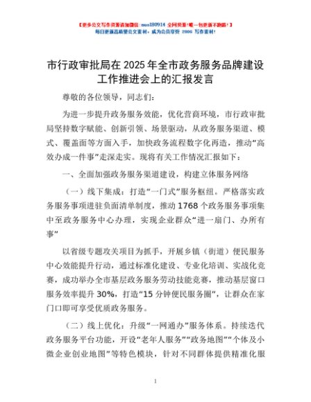 / 市行政审批局在2025年全市政务服务品牌建设工作推进会上的汇报发言