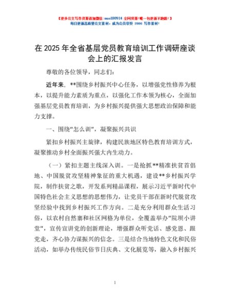 / 在2025年全省基层党员教育培训工作调研座谈会上的汇报发言