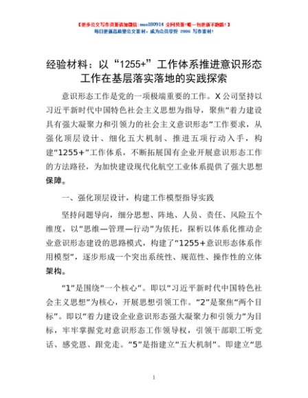 经验材料:以“1255+”工作体系推进意识形态工作在基层落实落地的实践探索