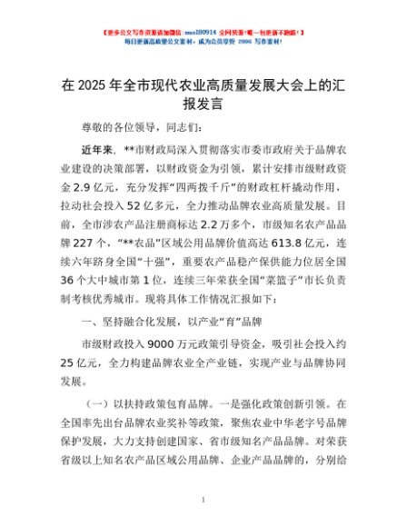 / 在2025年全市现代农业高质量发展大会上的汇报发言