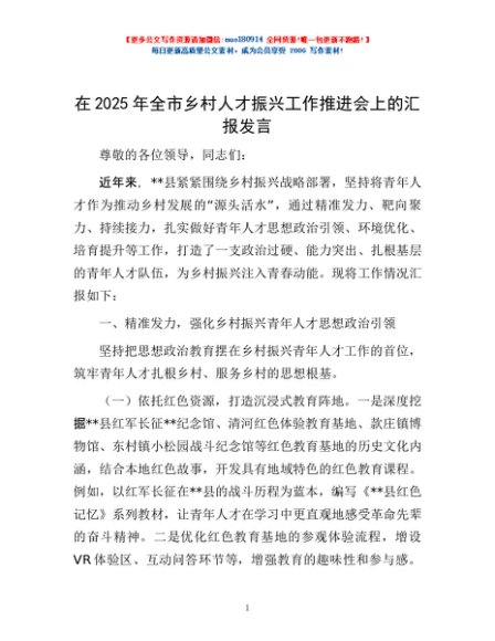 / 在2025年全市乡村人才振兴工作推进会上的汇报发言