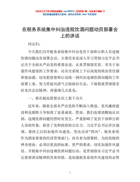 / 在税务系统集中纠治违规饮酒问题动员部署会上的讲话