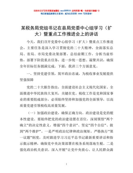 / 某税务局党组书记在县局党委中心组学习(扩大)暨重点工作推进会上的讲话