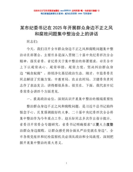 / 某市纪委书记在2025年开展群众身边不正之风和腐败问题集中整治会上的讲话