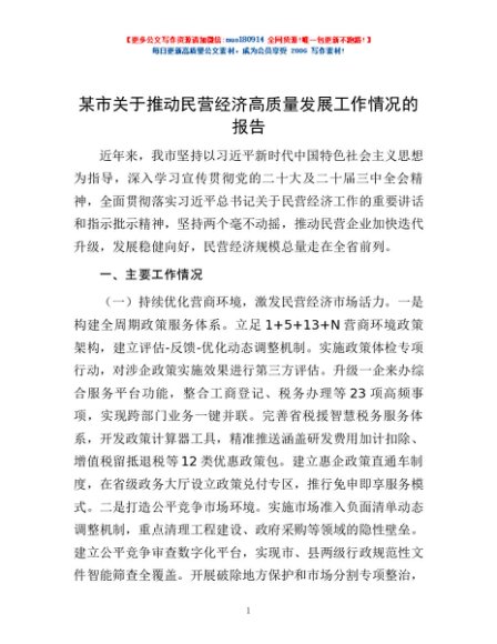 / 某市关于推动民营经济高质量发展工作情况的报告